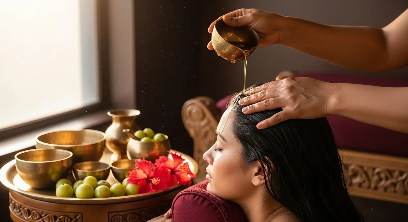 Ayurveda treats hair loss with herbal oils like Bhringraj, Amla, and Brahmi, internal detoxification, and stress-relieving therapies that nourish the scalp, improve blood flow, and restore healthy hair growth without chemicals.